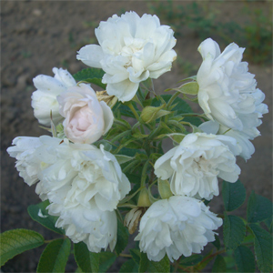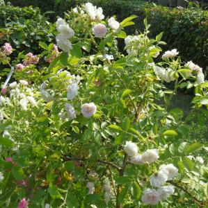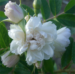 Die öfterblühende weiße Nelkenrose (Rosa-rugosa Hybride) hat kleine nelkenförmige Blüten . Ihr Wuchs ist bis 1,50 m und sie bevorzugt kühlere Standorte im Halbschatten.
