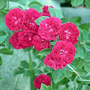 Die kleinen,intensiv roten Blüten sind dicht gefüllt und duften. Der starkwüchsige Rambler wächst 4 - 6 m hoch und ist wunderbar für Laubengänge u.ä. geeignet.