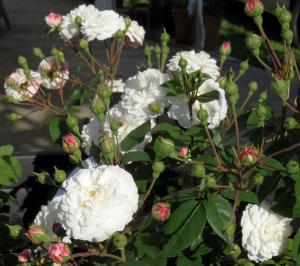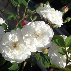 Stabile kleine weiße dichtgefüllte Pomponröschen , die sich aus rosa Knospen entfalten, sehen einfach nur bezaubernd aus. Diese kleine zierliche Rose ist als niedrige Beetrose, am besten in Gruppen gepflanzt, zu verwenden. Sie kommt aber im Kübel noch besser zur Geltung . Die Rose besitzt dunkelgrünes gesundes Laub. Sie gehört mit zu unseren Lieblingsrosen !
