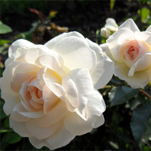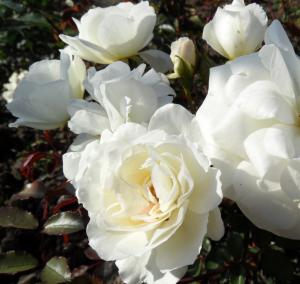 Leuchtend weiß zieren die rosettenartigen gefüllten Blüten in Büscheln diese duftende Rose, wobei die Knospe auch rosa schimmern kann. Sie blüht sehr ausdauernd bis in den Dezember. Ihr Wuchs bis 150 cm ist kräftig und buschig auf manchmal rötlichen Trieben mit glänzendem Laub.