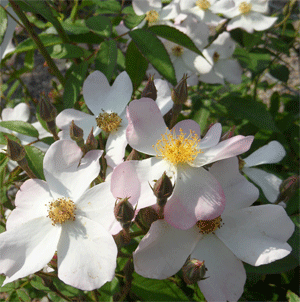 In Doldenrispen zeigen sich im Sommer die weißen Blütensterne, die mit einem Hauch rosa überzogen sind. Ein Traum !Die Größe der einfach geformten Blüten ist auffälliger als bei den meisten Ramblern. Sehr bienenfreundlich ! Die Rose duftet und wächst kräftig 5m x 3m. Deshalb ist die Rose sehr gut für Laubengänge , kleinere Bäume oder Pergolen.geeignet. Später zeigen sich die wunderschönen orangeroten Hagebutten . Eine unserer Lieblingsrosen!