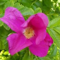 Diese Rose stellt sehr wenig Ansprüche an ihren Standort, sie wächst selbst auf Sandböden. Ursprünglich kommt sie auch aus Küstenregionen. Die ungefüllte Blüte ist rosarot und die großen flachkugeligen Früchte ab August reifend. Das Fruchtfleisch der Hagebutten ist sehr ergiebig und daher exzellent geeignet, um Marmeladen oder Tee´s herzustellen. Auch vögel fressen sie gern. Sie wächst bis 1,50m hoch und eignet sich auch ideal zur Böschungs- und Heckenbepflanzung .
