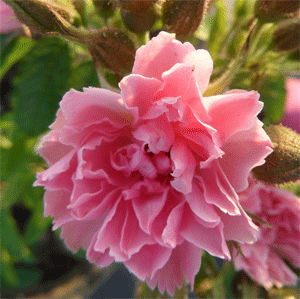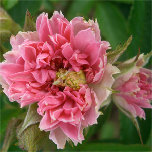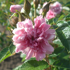Die vielen in großen Büscheln stehenden, kleinen Blüten sind reinrosa, locker gefüllt und am Rand nelkenartig gefranst. Diese öfterblühende Rosa rugosa Hybride ist sehr buschig und eignet sich sehr gut für die Heckenbepflanzung. Sie liebt kühlere Standorte im Halbschatten.