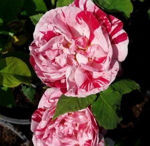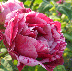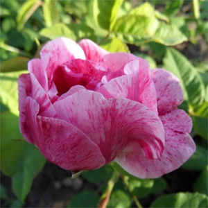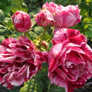 Unter den gestreiften Rosensorten ist diese eine der besten ,verlässlichsten und schönsten! Die großen Blüten haben eine dunkelrosa Grundfarbe und hellrosa bis weiße Marmorierungen. Diese unproblematische Panaschierte gibt sich wüchsig und gesund .Es erscheinen im ganzen Sommer immer wieder neue Blüten auf den aufrecht wachsenden Sträuchern bis 1,50m ,sie kann aber auch bis zu 2,5 m Höhe gezogen werden können.Die attraktiven duftenden Blüten erfreuen auch in der Vase . Eine unserer Lieblingsrosen !