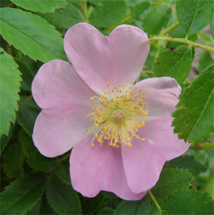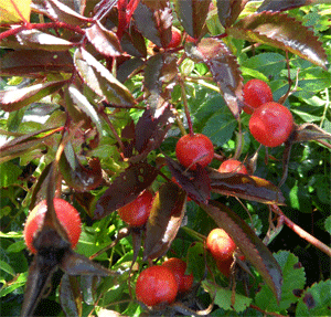 Mariae Graebnerae (R. virginiana) hat eine einfache kräftig rosafarbende Blüte von Juni bis September. Im Gegensatz dazu ist das Laub glänzend grün und die Triebe leicht rötlich. Im Herbst färbt sich dann das Laub so wunderschön rotgelb und die Pflanze trägt dann viele leuchtendrote runde Früchte. Sie ist eine bezaubernde kleinere kompakt wachsende Hagebuttenrose, auch für eine Heckenbepflanzung gut geeignet. Eine unserer Lieblingsrosen unter den Wildrosen!