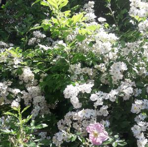 Der dünnzweigige Strauch hängt einmal im Jahr voller weißer kleiner Blüten in Rispen, die einen süßlichen Duft verströmen und eine Bienenweide darstellen.. Ab September entwickeln sich daraus viele erbsengroße, rote haltbare Hagebutten, die sich sehr gut floristisch verarbeiten lassen. Man kann Multiflora als Strauch , stark überhängend, als auch wie eine kleine Kletterrose behandeln, die sonnig sowie im Halbschatten stehen kann.Sie eignet sich als Solitär oder in Hecke gepflanzt . Die besondere Hagebuttenrose ist bei Vögeln sehr beliebt.Ökologisch sehr wertvoll !