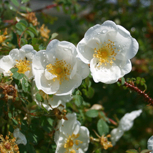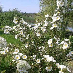 Diese tolle Wildrose ist unsere einheimische Dünenrose vom Meer. Bevor die Kartoffelrosen (Rosa rugosas ) die Küsten bevölkerten, war diese Bibernellrose dort zu Hause. Dementsprechend ist sie sehr an Klima und Sandböden angepasst und sehr anspruchslos. Ihre wunderschöne Blüte ist einfach und von weißer bis hellgelber Farbe. Die Pflanze wächst aufrecht buschig und kompakt und passt somit auch in ein normales Insekten-freundliches Beet. Sie ist sehr reich- und frühblühend und hat eine Höhe von ca. 1oo -150 cm . Man kann sie auch gut für die Heckenbepflanzung nutzen. Auf jeden Fall ist sie ein erster Blüher im Garten zu Narzissen und Tulpen und deshalb mit erste Bieneweide. Besonders schön sind auch im Herbst /Winter die schwarzen Hagebutten, die sich gut kulinarisch verwerten lassen.Ökologisch wertvoll ! Eine unserer Lieblingsrosen !